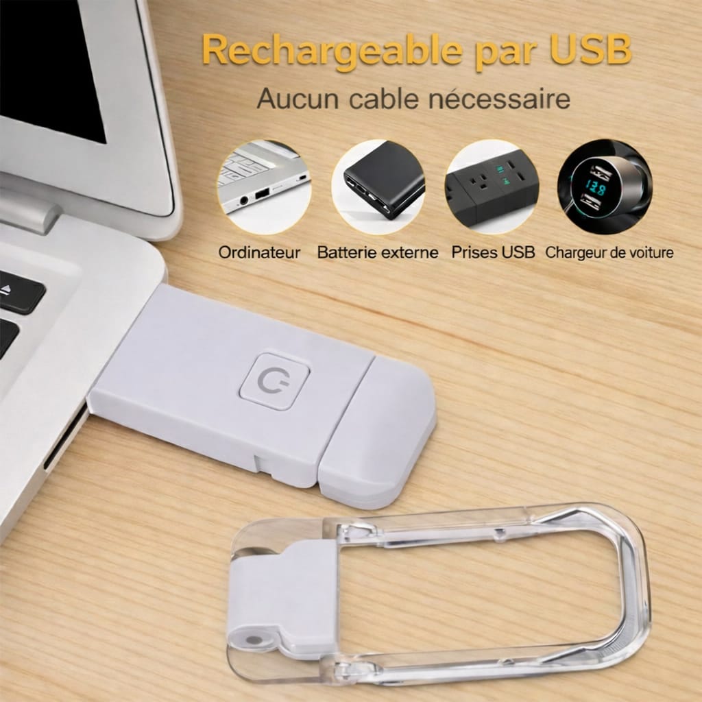 ✓ Rechargeable par USB — se recharge facilement via ordinateur, powerbank ou adaptateur USB.